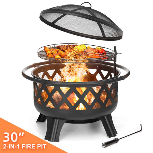 30", 2-in-1 Fire Pit with Movable BBQ Grill, Wood Burning Outdoor, Steel Firepit Bowl for Backyard, Patio, Outdoor Living