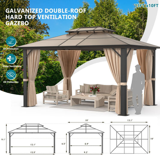 10'x13' Hardtop Gazebo, Double Roof Canopy with Curtains and Netting. Pair with Gazebo EZ-Way Magnetic Screen for easy Entry and Exit.