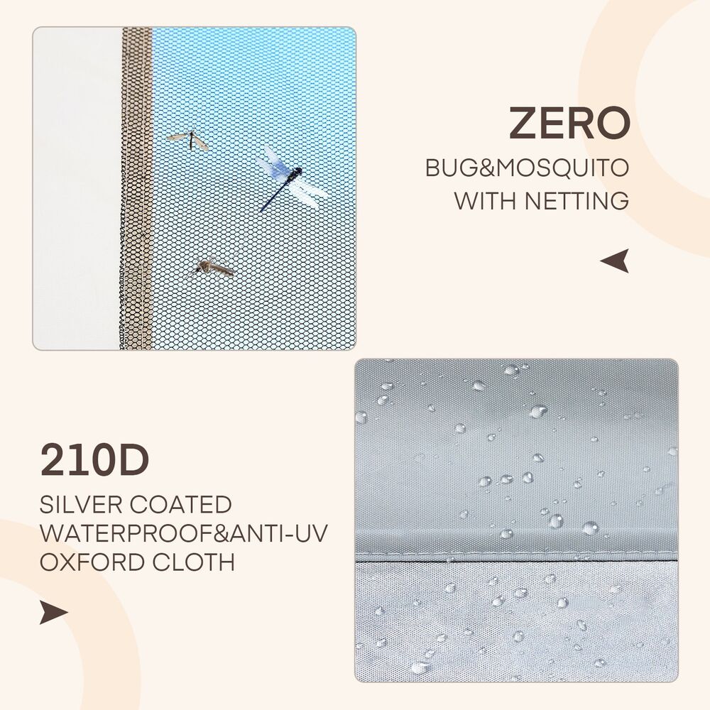 DURABLE: The pop-up canopy tent with mesh is made of heavy-duty aluminum and steel and 210D silver-plated oxford cloth. While steel helps stabilize the canopy, the oxford cloth is of good quality and will last for years. All in all, the canopy provides you with a long-lasting use experience.