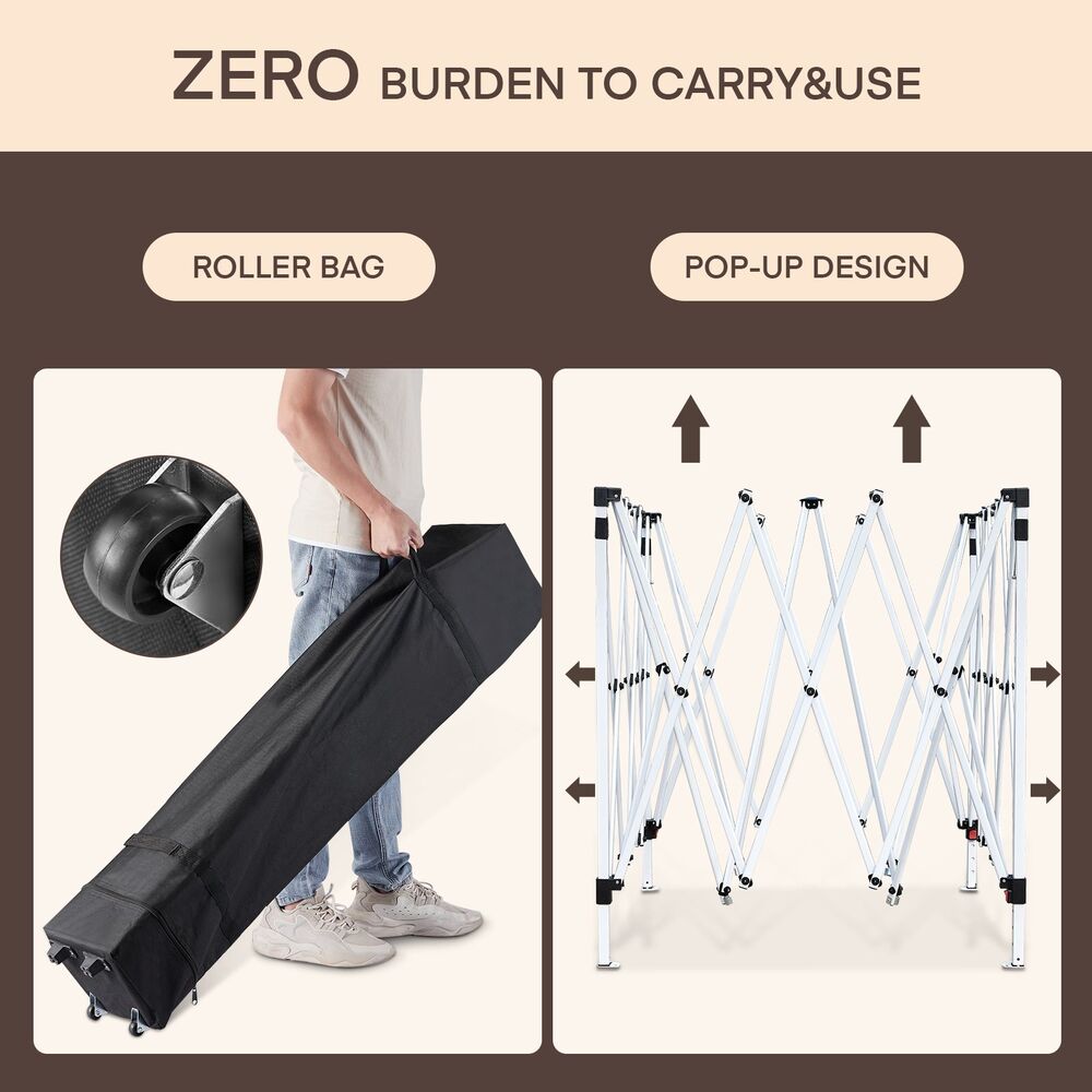 Wheeled Carrying Bag and Size: The pop up canopy tent with rolling carrying bag is convenient for you to carry it anywhere. The scroll wheel can be rotated 360°. The total canopy tent is 10FTX10FTX8.2FT. And the overall trolley bag is only 8.3''x8.3''x46.5''. You can conveniently take your canopy shelter with you.