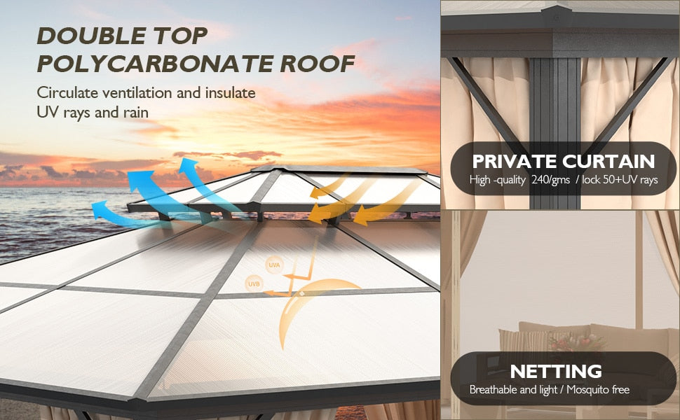 POLYCARBONATE DOUBLE ROOF TOP: Our hardtop gazebo features a ventilated, double-layer polycarbonate roof to keep the heat down and UV-block 99% and achieve better ventilated and optimum airflow, offering a place to enjoy the weather.