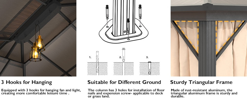 STURDY ALUMINUM FRAME: This gazebo was designed by aluminum frame and used powder-coated rust-resistant that should last a long time, resistant to rust, corrosion and chipping during all seasons. The feet with holes to improve stability in windy conditions.