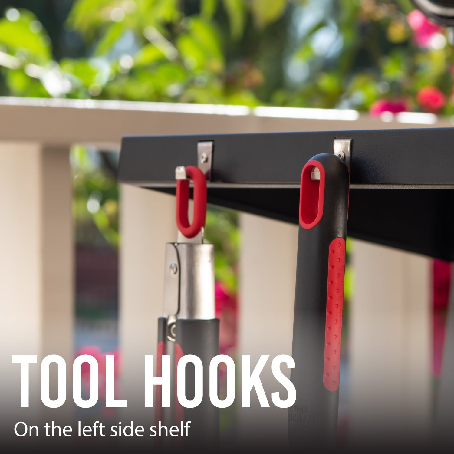 - Two fixed side shelves offer ample space for food prep, plus attached hooks on the left are perfect for storing grill tools.